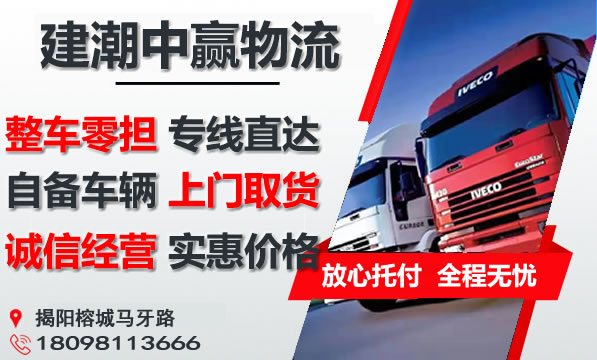 揭阳到泰州靖江市物流专线是建潮中赢物流主营重点物流线路之一,提供4.2-17.5米整车包车运输,零担专线,可上门取货,量大免费提送货;揭阳到泰州货运专线价格实惠,欢迎来电咨询。
